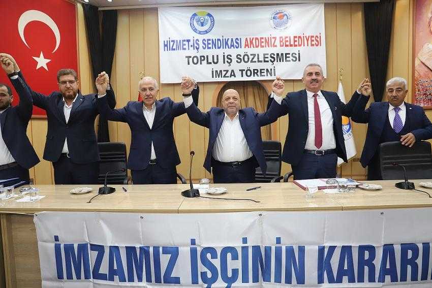 Konuşmalardan sonra Akdeniz Belediye Başkanı Mustafa Gültak ile Hak-İş Konfederasyonu ve Hizmet-İş Sendikası Genel Başkanı Mahmut Arslan arasında toplu iş sözleşmesi imzalandı.