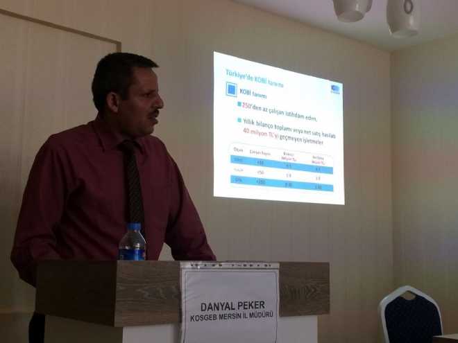 KOSGEB Mersin İl Müdürü Sayın Danyal PEKER sunumunda; Türkiye’de kurulan işletmelerin %98’inin KOBİ olduğunu ve bu işletmelerin büyük bir bölümünün 2-3 yıl içerisinde iflas ettiğini, bu durumun en büyük sebepleri arasında ise firmanın kurumsallaşamaması ve finansman yetersizliği olduğunu, KOSGEB’in verdiği teşvik, hibe ve desteklerin de işletmenin kurumsallaşmasına yönelik “ENTELEKTÜEL DESTEK” ve bunun finansmanı olduğunu belirtti. PEKER ayrıca KOSGEB’in yeni iş kurmak isteyenler için “GİRİŞİMCİLİK” ve “İŞ BİRLİĞİ, GÜÇ BİRLİĞİ”, KOBİGEL, gibi imalat sektörüne yönelik destekleri hakkında bilgiler verdi.