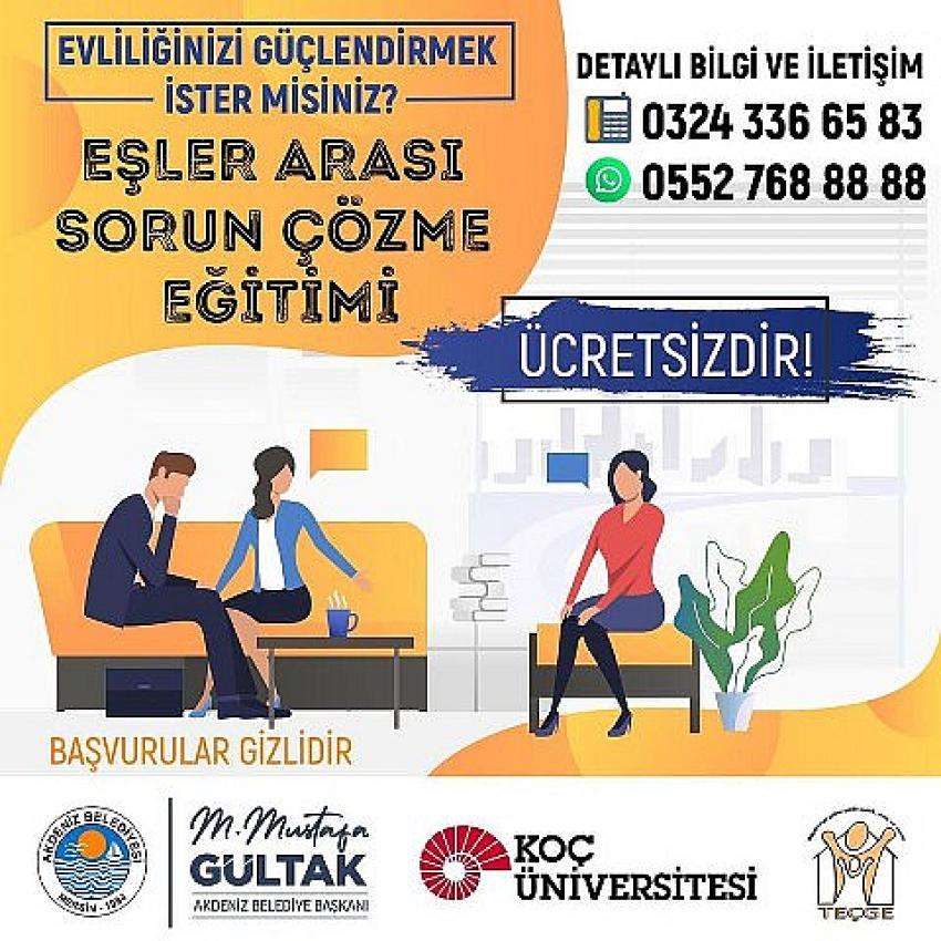 Akdeniz Belediyesi’nin, Koç Üniversitesi işbirliğiyle gerçekleştireceği; evlilik bağını güçlendirmeyi ve eşler arasındaki çatışma ve sorunları çözme becerisini artırmayı amaçlayan; "Eşler Arası Sorun Çözme Eğitimi" başlıyor.