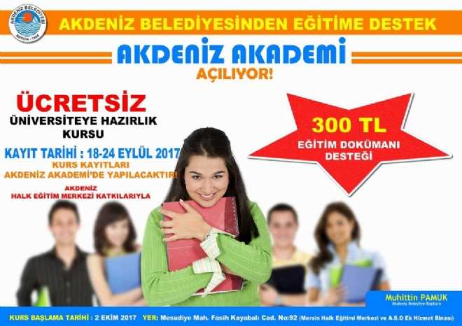 Akdeniz Belediyesi olarak Üniversiteye hazırlanan gençlerimize destek olmak amacıyla Akdeniz İlçe Halk Eğitim Müdürlüğü ile birlikte AKDENİZ AKADEMİ’yi kurduklarını söyleyen Belediye Başkanı Muhittin Pamuk konuyla ilgili yaptığı açıklamada; ‘Gençlerimiz ülkemizin geleceği, onların iyi bir eğitim almasını ve yetenekleri doğrultusunda mesleklere sahip olmasını istiyoruz.Bilindiği gibi Üniversite Hazırlık kursları ücretleri, kitap masrafları ile birlikte öğrenciler ve veliler için önemli bir gider oluşturuyor. Bu projeyle; Üniversite Hazırlık Kurslarına gitme imkanına sahip olmayan öğrencilerimize yalnız olmadıklarını, Belediyemizin yanlarında olduklarını göstermek istiyoruz.AKDENİZ AKADEMİ ile öğrencilerimiz ücretsiz olarak öğretmenlerimiz tarafından Üniversite sınavına hazırlanacak ve bütün kursiyer öğrencilerimize 300 tl eğitim dökümanı desteğinde de bulunacağız’ şeklinde konuştu.Başkan Pamuk, bu kurstan yararlanmak isteyen öğrencileri bu hafta sonuna kadar Akdeniz ilçe halk eğitim müdürlüğü binasında kursa kayıt olmaya davet etti.