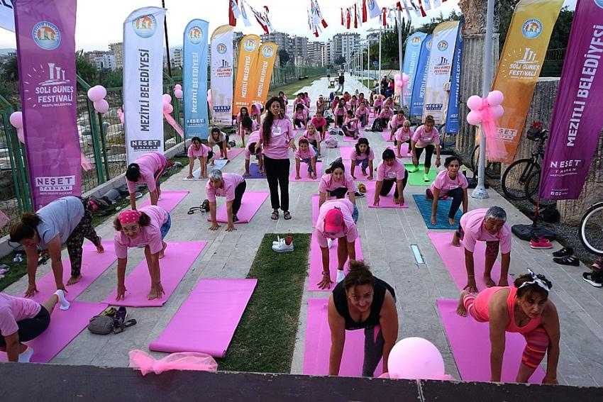 Mezitli’de kadınlar meme kanserine dikkat çekmek amacıyla pembe kıyafetleriyle yoga yaptı. ‘Korkma, farkında ol, geç kalma!’ sloganıyla gerçekleştirilen etkinlikte çağımızın en büyük sağlık sorunlarından birisi olan meme kanserine dikkat çekilirken, kadınlara erken teşhis ve tedavi konusunda bilgilendirme yapıldı.