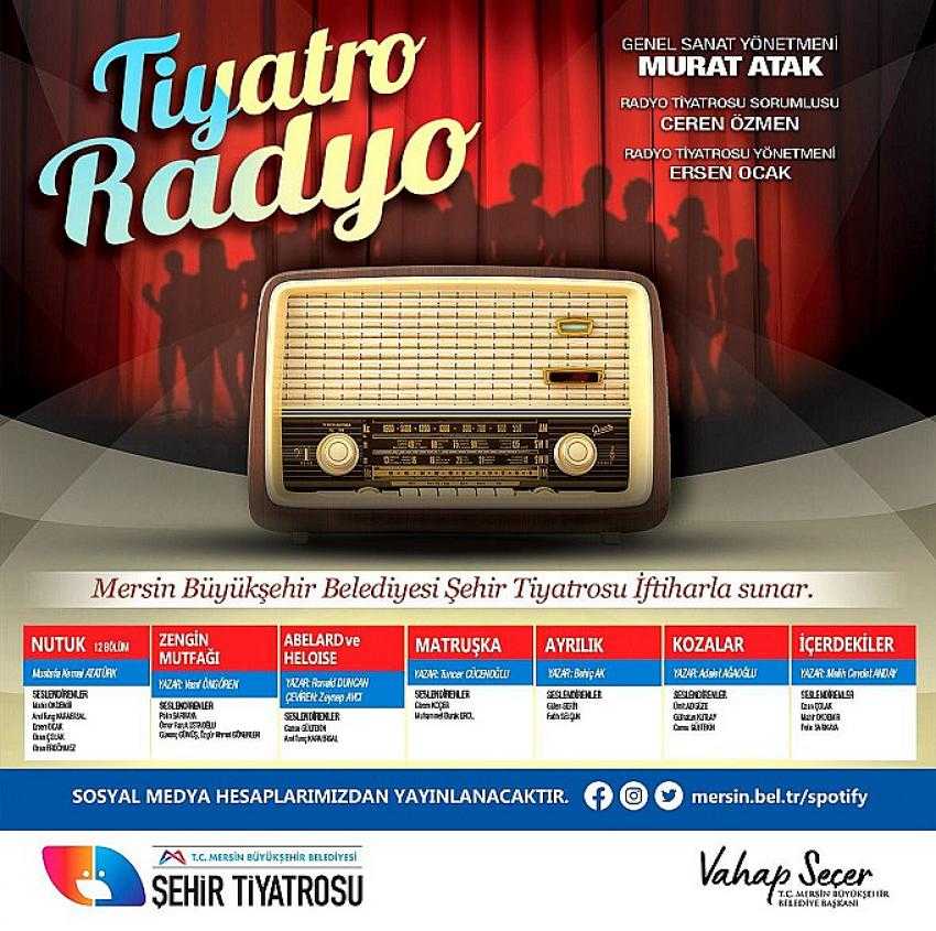 Mersin Büyükşehir Belediyesi, Radyo Tiyatrosu ile Mersinli sanatseverlerle dijital platformda buluşmayı sürdürüyor. Pandemi nedeniyle perdelerini kapalı tutmak zorunda kalan Büyükşehir Belediyesi Şehir Tiyatrosu, Radyo Tiyatrosu ile seyircilerin evlerine konuk oluyor.