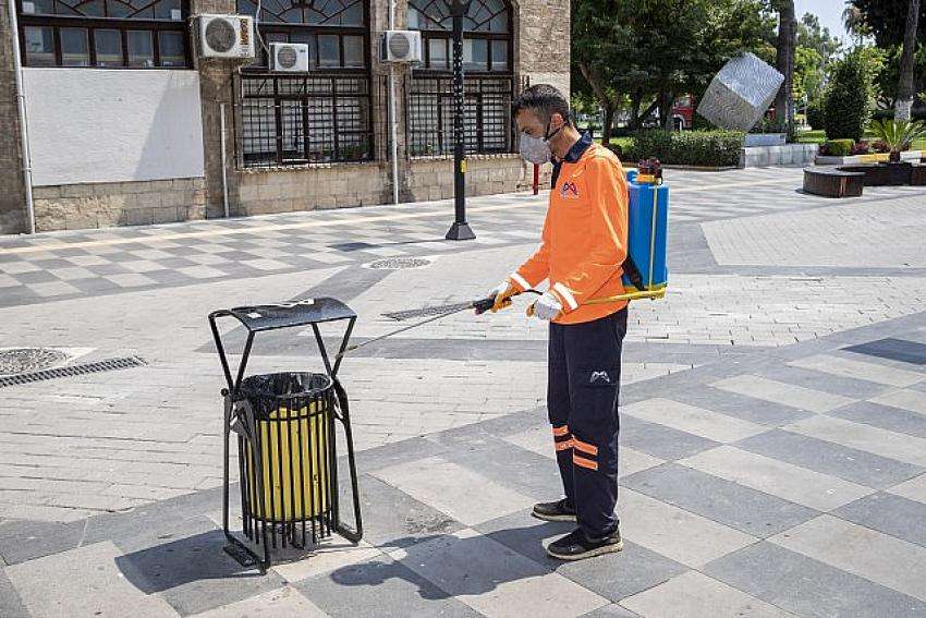 Ekiplerin dezenfeksiyon uygulaması yaptığı alanlardan birisi de Akdeniz ilçesi Atatürk Caddesi oldu. Büyükşehir Belediyesi Ana Hizmet Binası (Taş Bina) başta olmak üzere pek çok kamu kurumunun yer aldığı caddede çalışma yürüten ekipler, vatandaşların sık kullandığı alanları dezenfekte etti. Duraklardan banklara, ATM’lerden çöp kovalarına kadar pek çok noktada uygulama gerçekleştiren ekipler, vatandaşların yoğun olarak bulunduğu Ulu Çarşı gibi çok sayıda noktada çalışma yürüttü. Ekipler, işlek noktaları bayram sonrası vatandaşların güvenle kullanabilmesi için hazır hale getirdi.
