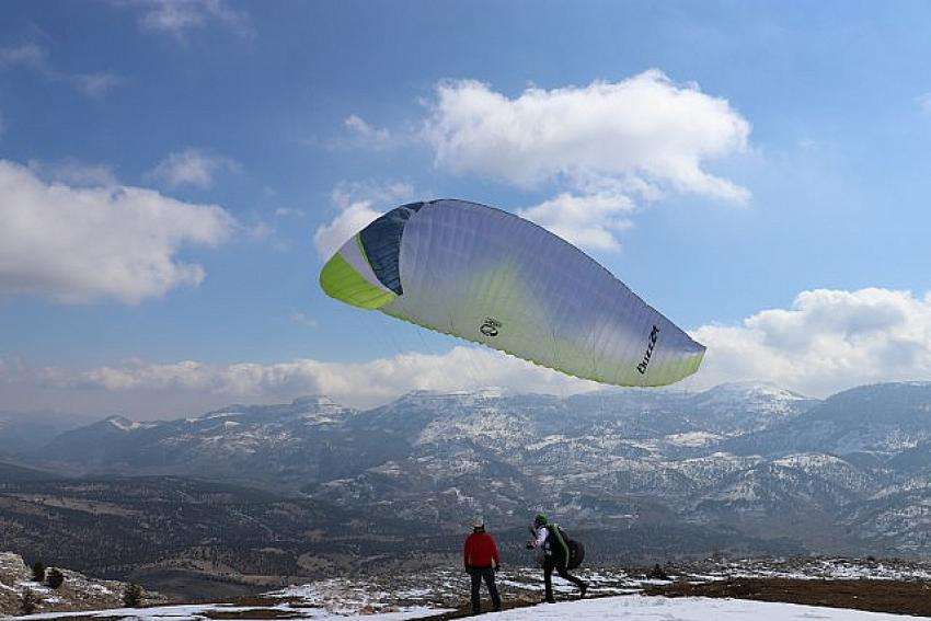 Toroslar'ın 1453 rakımlı Arslanköy Yaylası, yamaç paraşütü tutkunlarını ağırladı. Sporcular, kar manzarası eşliğinde Toroslar'ın semalarında doğanın keyfini çıkarırken, şanlı Türk Bayrağı'nı da dalgalandırdı.