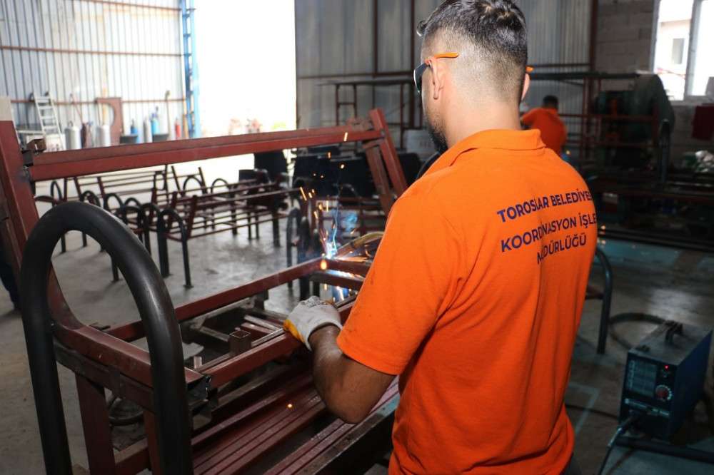 Toroslar Belediyesi Koordinasyon İşleri Müdürlüğü bünyesinde bulunan demir, boyahane, marangoz ve kaynak atölyelerinde belediye personeli tarafından titizlikle üretilen malzemeler, ilçedeki park ve yeşil alanlar ile ihtiyaç duyulan noktalara yerleştiriliyor.   Atölyelerde; basketbol ve futbol sahaları, engelli rampası ile mülkiyeti belediyeye ait olan muhtarlıkların çatı onarımları ve bakımları da yapılıyor.   “Üreten Belediyecilik Anlayışıyla Çalışıyoruz”   Toroslar Belediye Başkanı Atsız Afşın Yılmaz, kendi öz kaynaklarını etkin ve verimli bir şekilde kullandıklarını kaydederek; “İlçemizde ihtiyaç duyulan alanlara yerleştirdiğimiz kent mobilyalarının üretimini yaparak önemli oranda tasarruf sağlıyoruz” dedi.   “Ürettikçe güçlenen bir Toroslar oluşturduk” diyen Başkan Yılmaz, belediye atölyelerinde üretimin tüm hızıyla devam ettiğini belirterek; “Üretim, ülkenin ve dünyanın geleceğinde önemli bir yere sahip. Kendi atölyelerimizde üretim yapmak ve ülke ekonomisine katkı sağlamak bizim için en büyük mutluluk. İlçemizin bir parçası olan kent mobilyalarını da atölyelerimizde üreterek ihtiyaçları anında gideriyoruz. Böylelikle ilçemize değer katıyoruz” şeklinde konuştu.