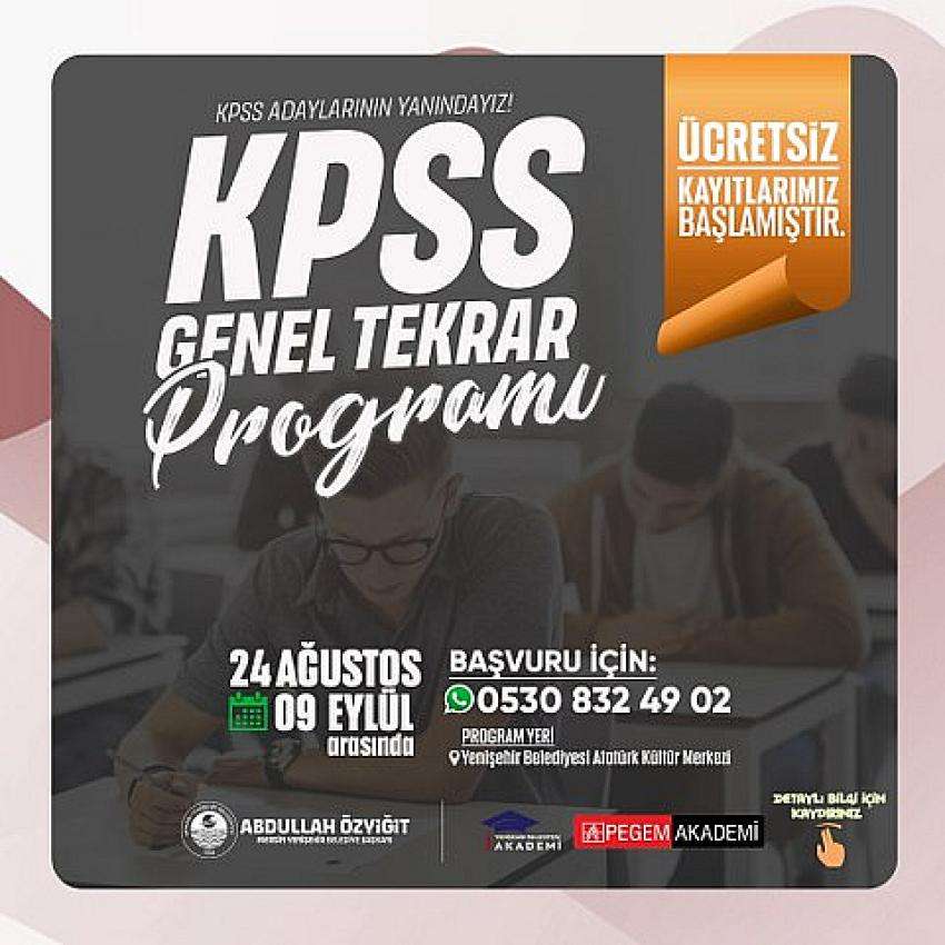 Mersin Yenişehir Belediyesi, 18 Eylül'de yapılacak Kamu Personeli Seçme Sınavı (KPSS) adaylarına 10 günlük ücretsiz genel tekrar programı ile destek verecek. Yenişehir Belediye Başkanı Abdullah Özyiğit, Mersin'deki adayları eğitimlere katılmaya davet etti.