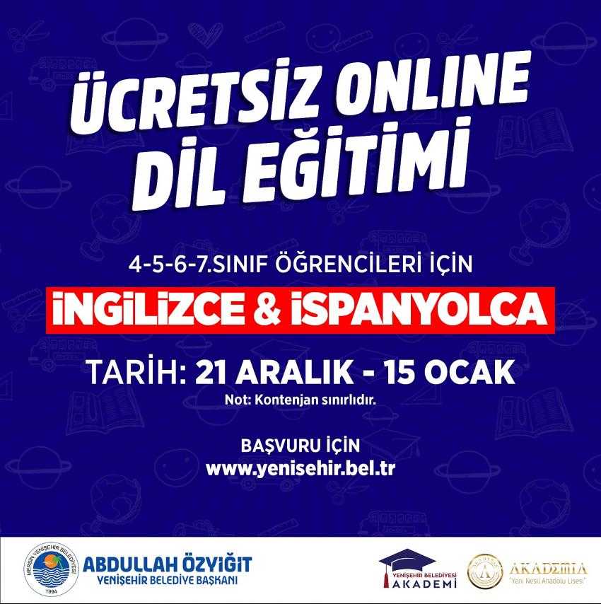 Uzaktan eğitim sürecinde öğrencileri desteklemeye devam eden Mersin Yenişehir Belediyesi, 4-5-6-7.sınıf öğrencileri için ücretsiz online İngilizce ve İspanyolca dil eğitimi verecek. Belediye Başkanı Abdullah Özyiğit, öğlencileri başvuru yapmaya davet etti.