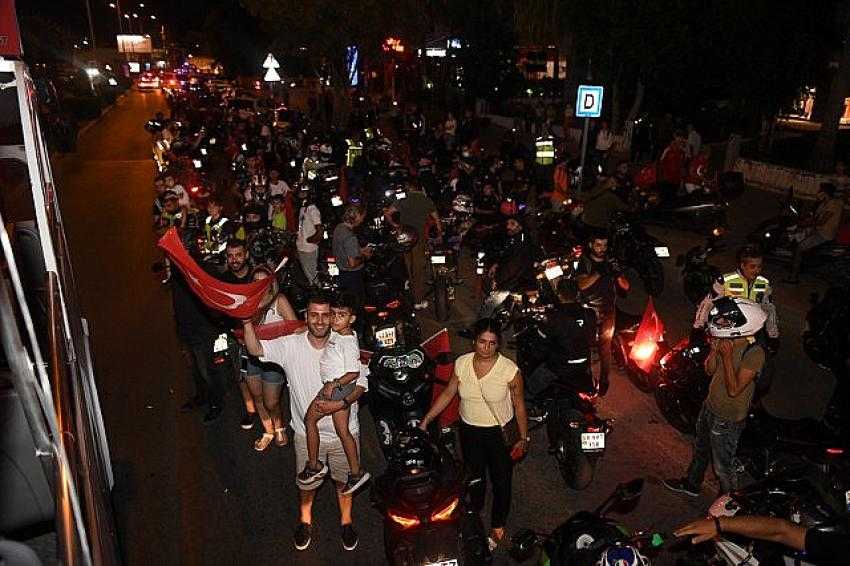 Otobüsten yükselen müzik eşliğinde kortej güzergahı boyunca evlerinin balkonundaki vatandaşları ve sokaktaki vatandaşları selamlayan katılımcıların Zafer Bayramı coşkusu Forum Mersin'de sonlandı.